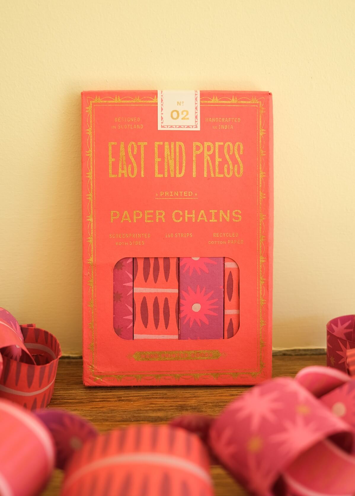 Paper chain kit containing 160 strips of recycled, patterned pink and red paper to make a garland approximately 10 metres long. Simply create a loop with each strip and link them together, securing the ends together with glue or staples. The paper is printed by hand on both sides so your paper chain will look great from all angles. Stick with a coloured theme, or mix and match with our other paper chain kits to create a multi-coloured paper chain medley!